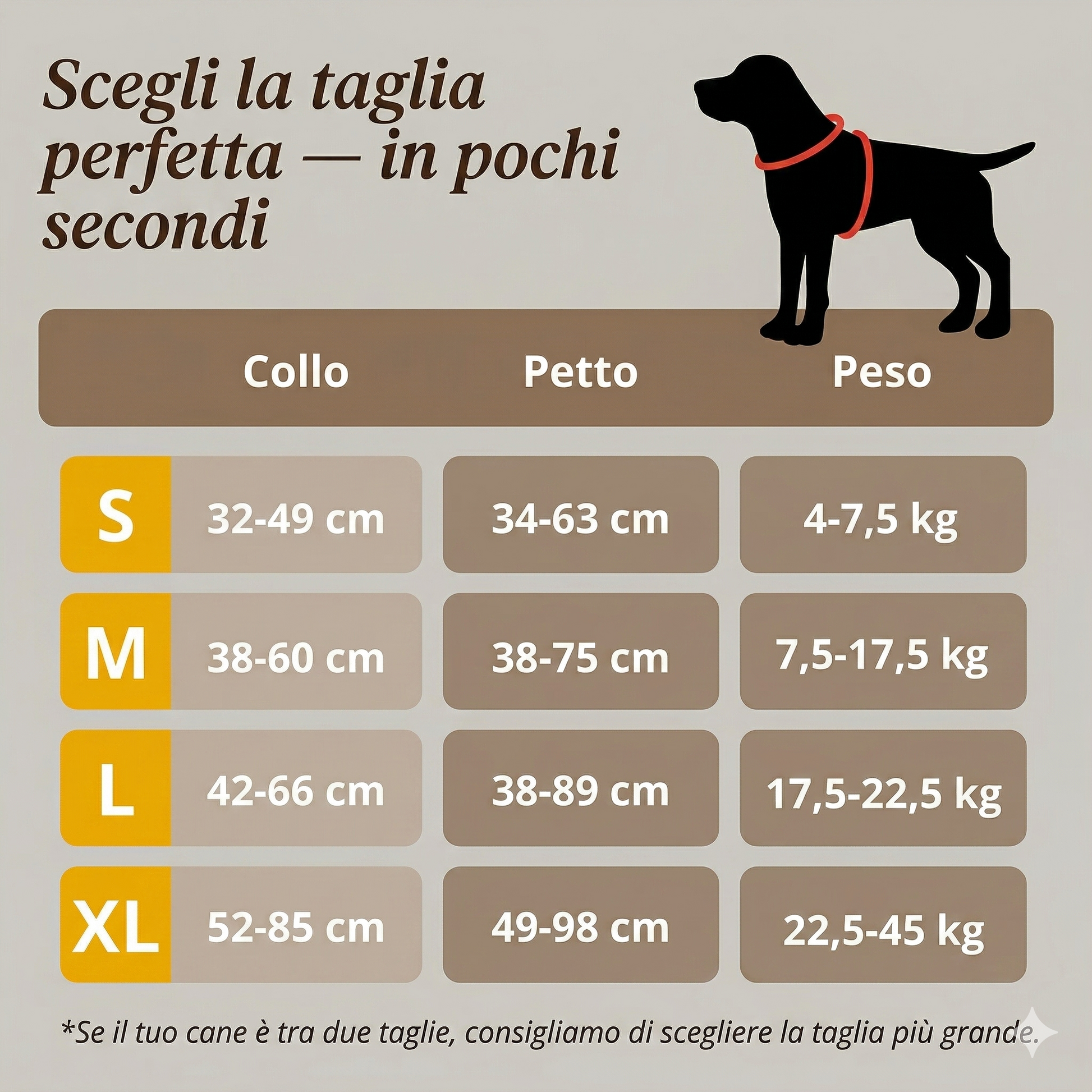 Con uno sguardo alla tabella delle taglie trovi subito la scelta giusta per il tuo amico a quattro zampe. Se il tuo cane è tra due taglie, scegli quella più grande: le cinghie regolabili si adattano in modo individuale.