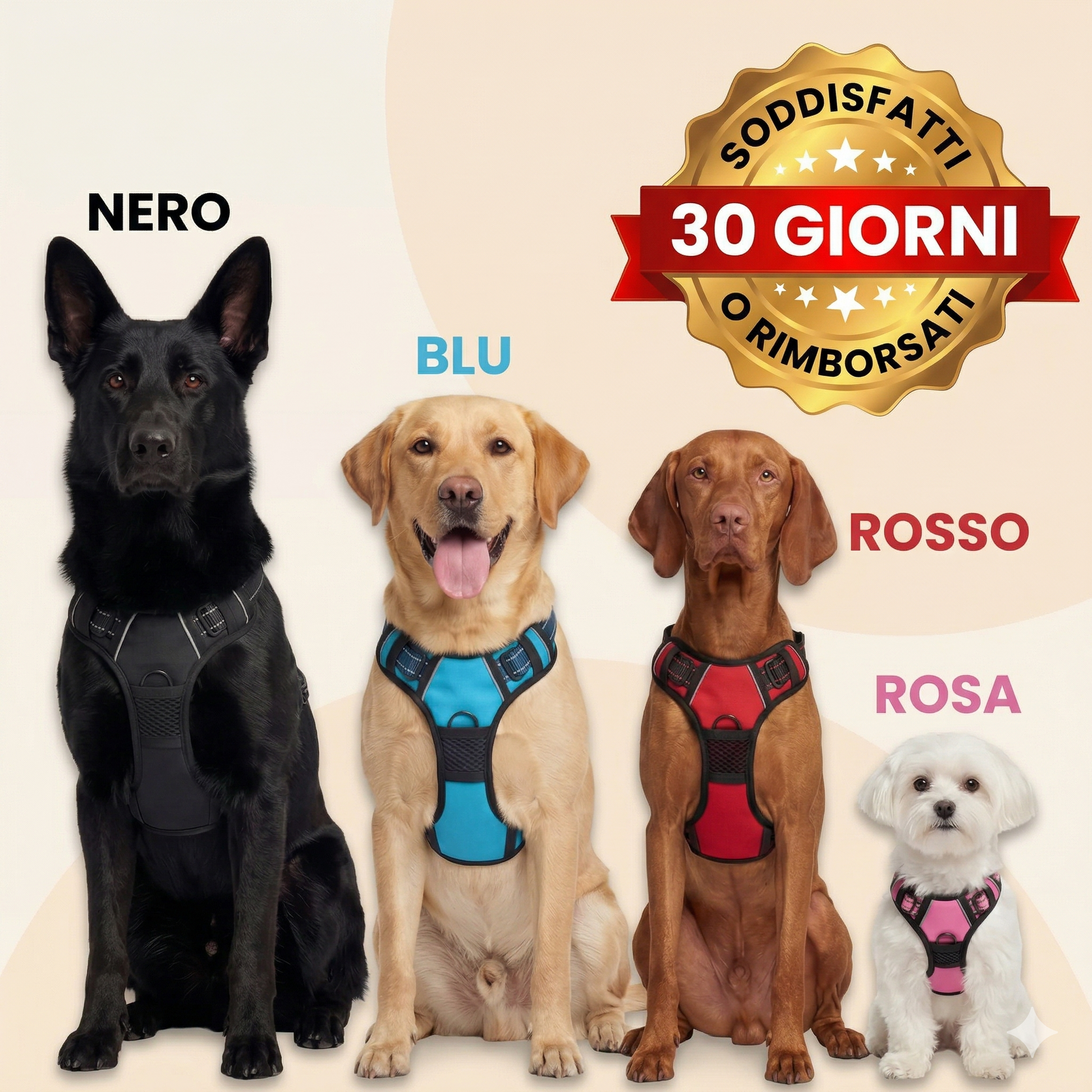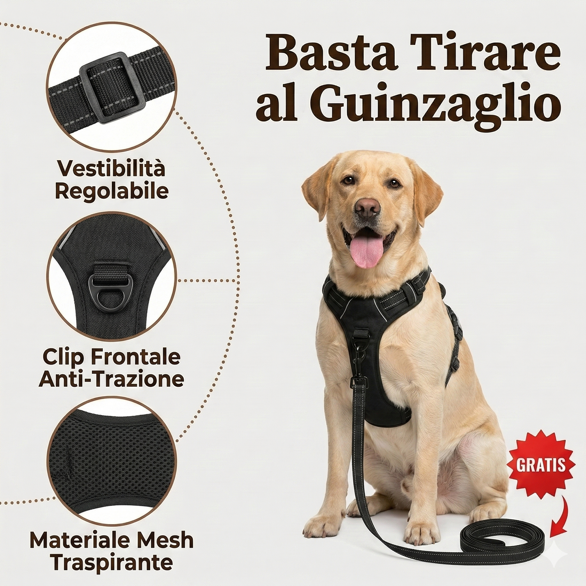 Una pettorina distribuisce la pressione su petto e spalle invece che sul collo. Questo significa più comfort, meno stress e un controllo più sicuro, soprattutto con i cani che tirano ancora molto al guinzaglio.